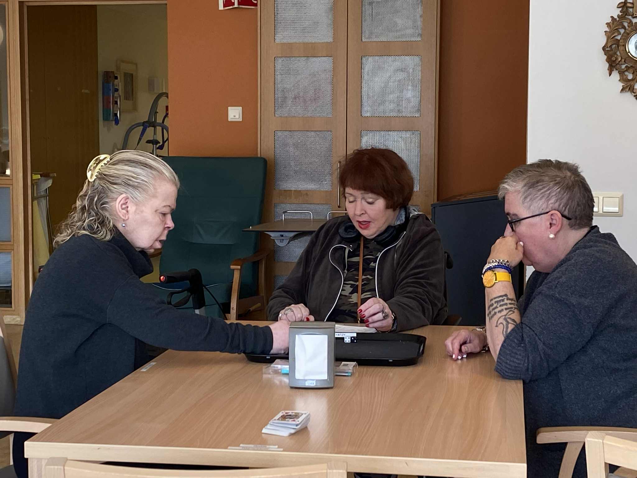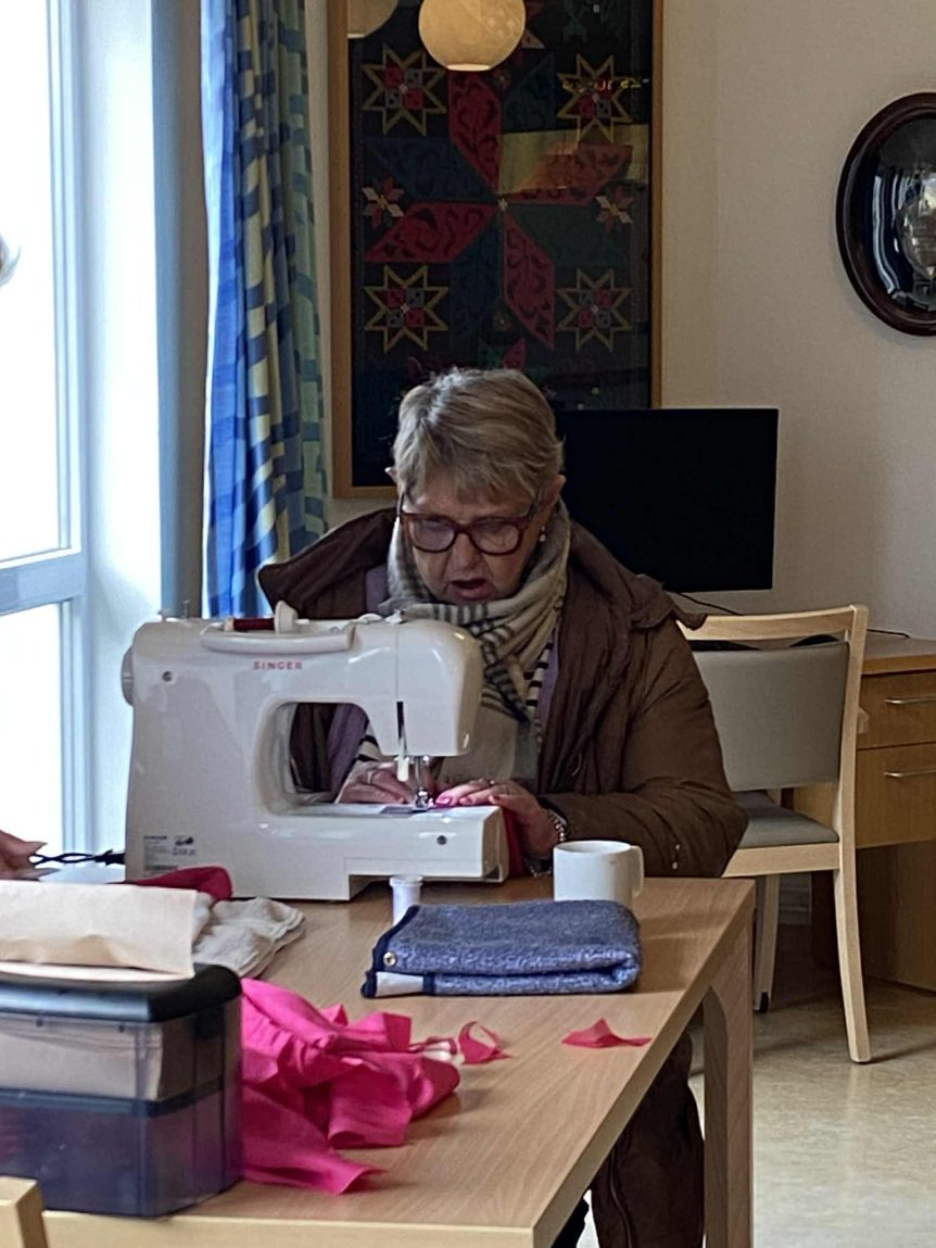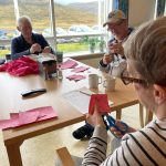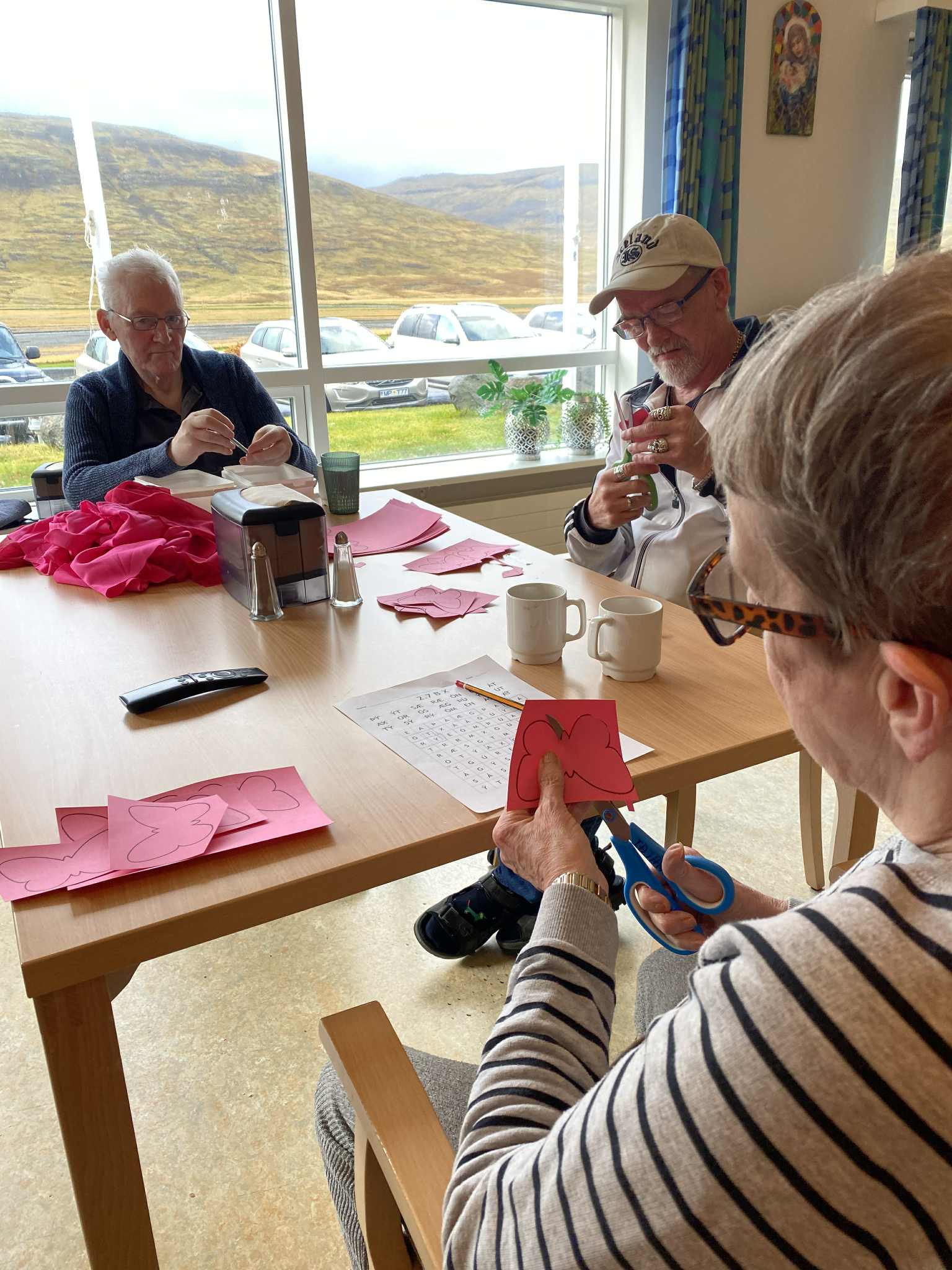 Bleik verkefni og fleira Í Iðjunni-vinnustofu í dag, unnum við ýmis bleik verkefni en einnig var Yatzy-ið ekki langt undan 😉 Daníela saumaði bleikar slæður fyrir allar konur á Fellsenda og aðrir klipptu út bleik fiðrildi sem áttu eftir að fara upp á vegg.