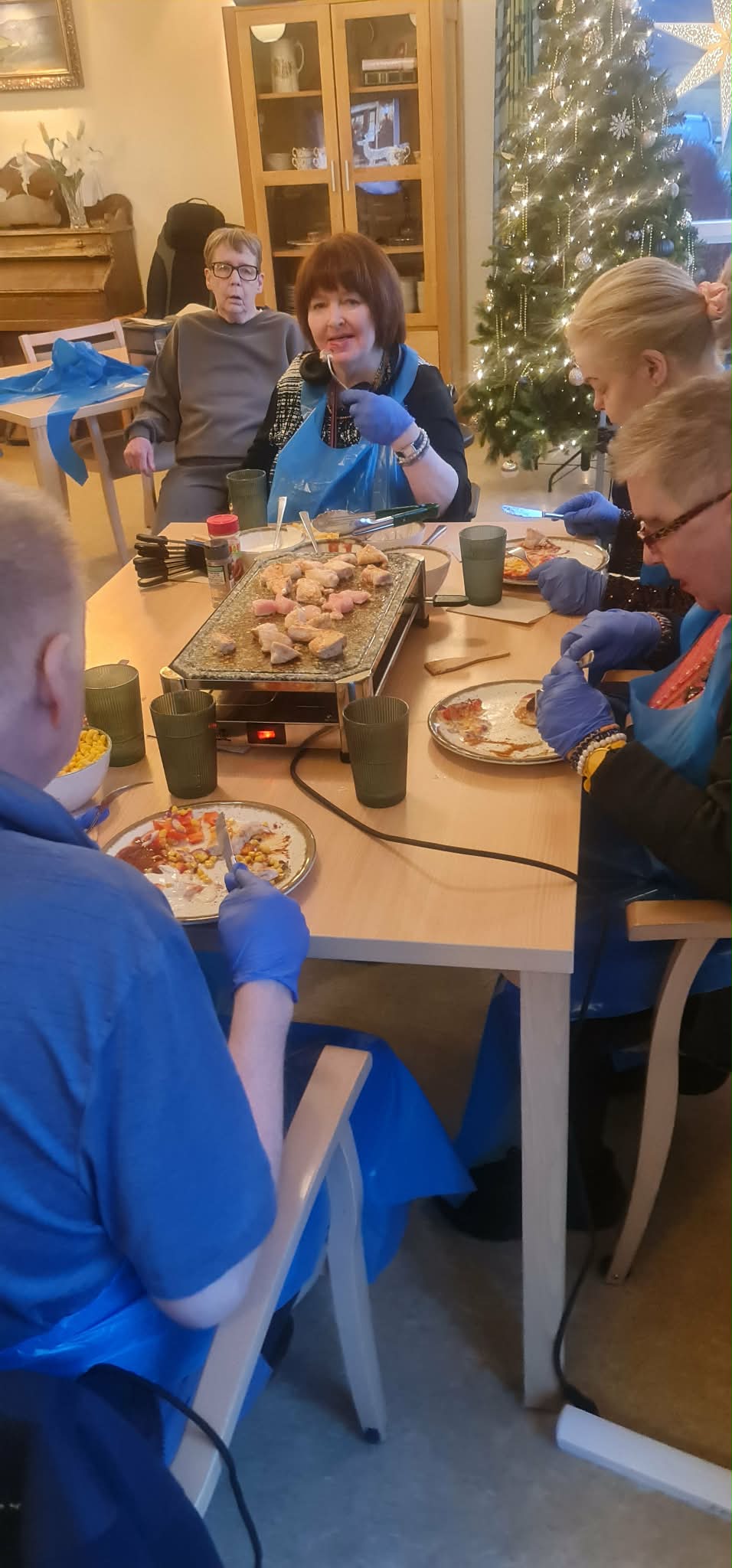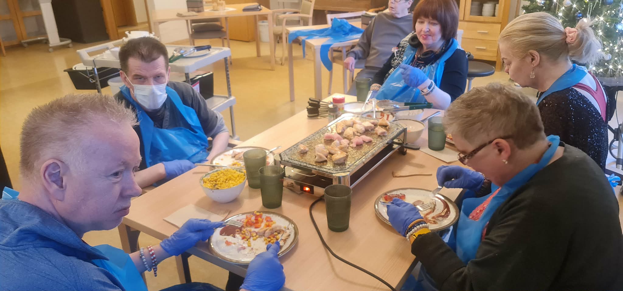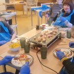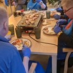 Á síðasta matreiðslunámskeiði ársins var kjúklingur á boðstólnum ásamt meðlæti. Val á matseðli námskeiðsins einskorðast við að það sé hægt að elda allt á pönnunni (sést á miðjunni á borðinu) þar sem við höfum ekki aðra aðstöðu eins og er, en unnið er að breytingum 🙂