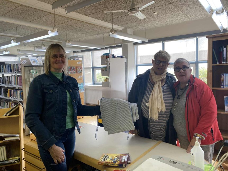 Stöllurnar Anna Þóra og Daníela Jóna gerðu sér lítið fyrir og saumuðu taupoka til að gefa Héraðsbókasafni Dalasýslu undir bækur þegar þær fara í útlán. Þær skruppu á bókasafnið og hittu þar bókavörðinn hana Sigríði Jónsdóttur, Siggu.
